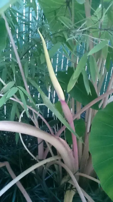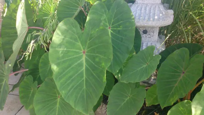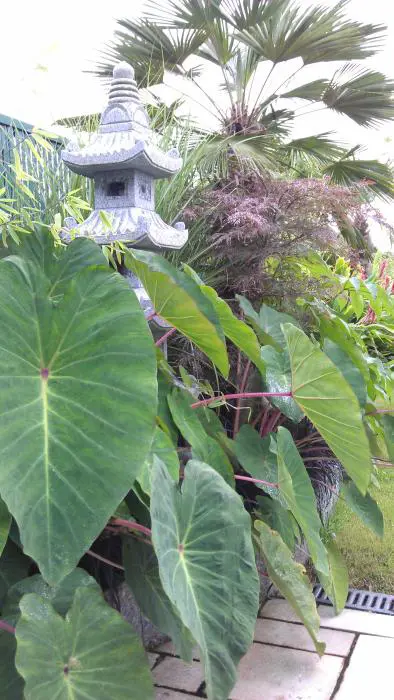 Colocasia esculenta 'Pink China' is een moerasplant met enorm grotefrisgroene bladeren tot soms 1m groot. De nerven en de stengels zijn roodroze van kleur.