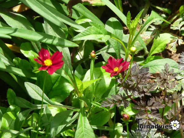 Coreopsis 'Mercury Rising' is een bossige, heuvelvormende vaste plant met leerachtige, smal lancetvormige, frisgroene bladeren.