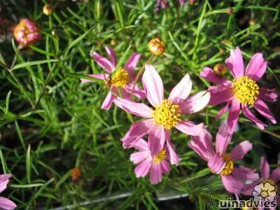 Coreopsis rosea 'American Dream' is een compacte bossige,vaste plant met donkergroen, fijn gevederd blad en een overvloed aan kleine donkerroze, madeliefachtige bloemen met een klein geel hartje.