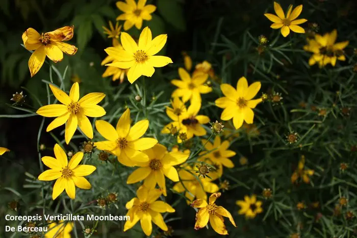 Coreopsis verticillata 'Moonbeam' is een compacte, heuvelvormende vaste plant met fijn verdeeld, donkergroen blad.