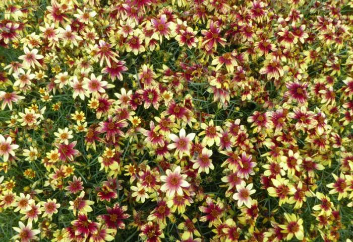 Heel de zomer lang bloeien aan lange, rechtopgaande stengels, madeliefjesachtige bloemen. Het zijn zeer opvallende bloemen, tweekleurig met rood en zachtgeel. Geen 2 bloemen zijn identiek, telkens anders gevlekt. In de lente zijn ze meer citroengeel, in de herfst krijg je meer robijnrode bloemen.
