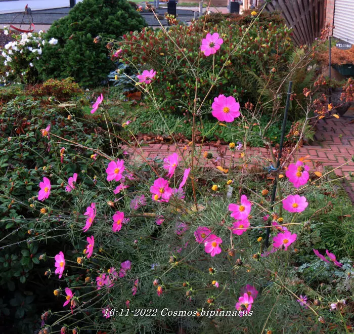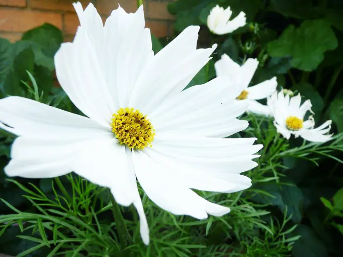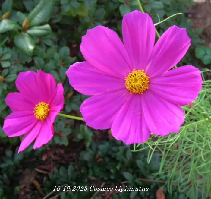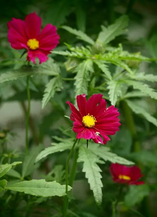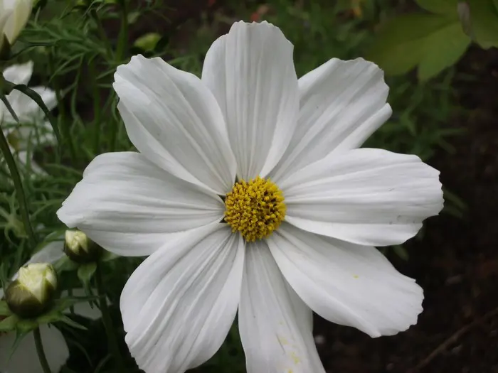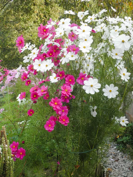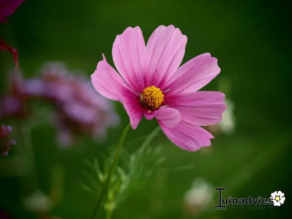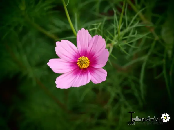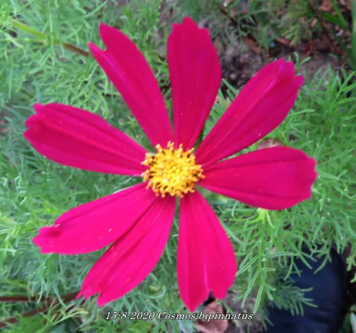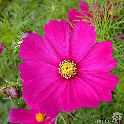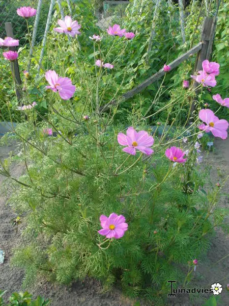 Cosmos bipinnatus is een forse eenjarige plant met witte, roze of wijnrode margrietachtige bloemen en met fijn geveerd frisgroen loof.