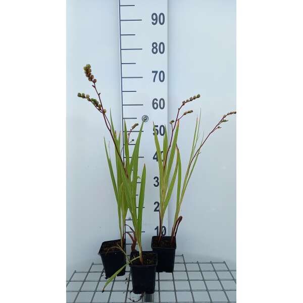 Heeft opstaande, lansvormige, heldergroene bladeren.