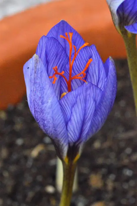 Crocus cancellatus subsp. cancellatus bloeit licht blauwlila met donkerder streepjes wat erg mooi is in combinatie met de oranje stempels.