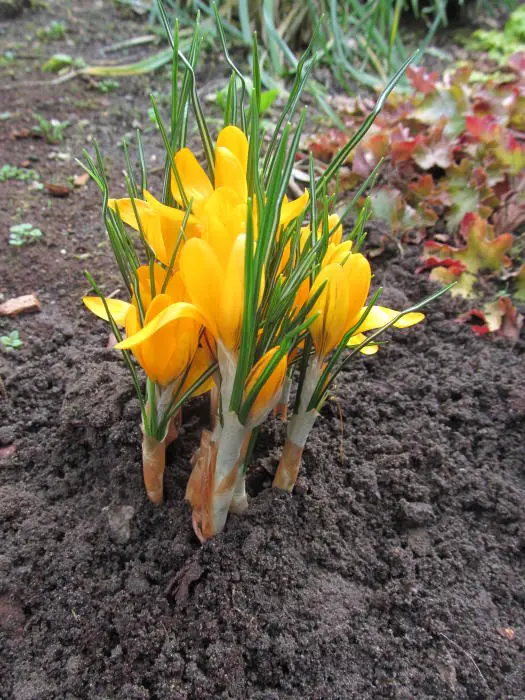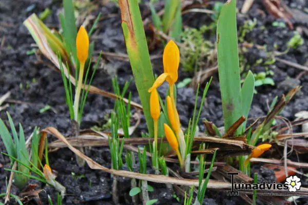 Crocus flavus is afkomstig uit de balkan en bloeit met stervormige gele krokussen met een donkerder keel.
