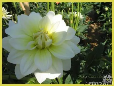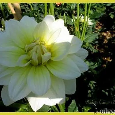 Dahlia 'Cream Beauty' is een decoratieve dahlia met goed gevulde grote bloemen en brede platte, cremegele bloemblaadjes.