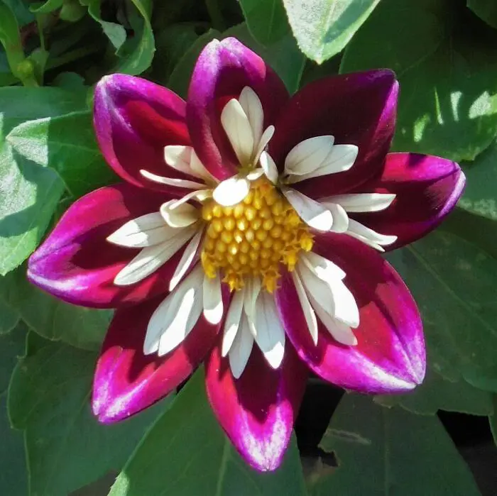 Bloemen hebben één rij brede, platte helderrode lintbloemen. Rond het geel hart een rij van lange roomgele buisbloemen.