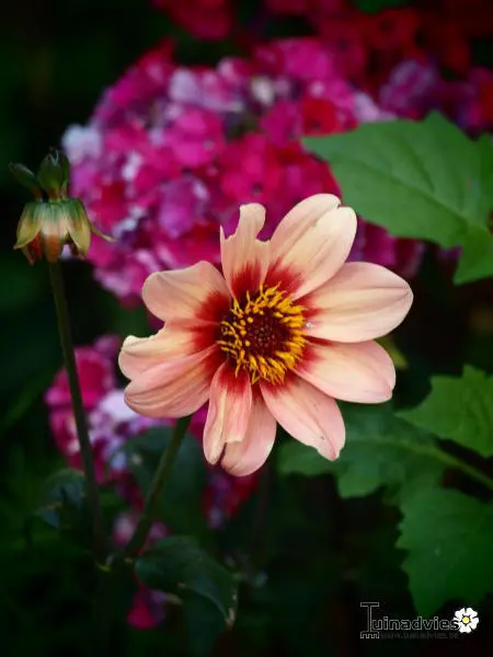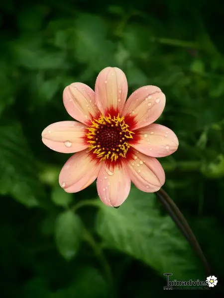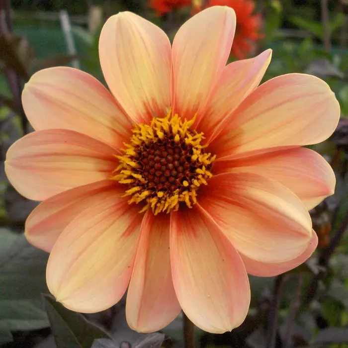 Dahlia Happy Single First Love bloeit met enkelvoudige zacht perzik/abrikoosoranje bloemen met rond het bruin hart een rode ring.