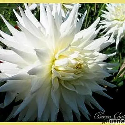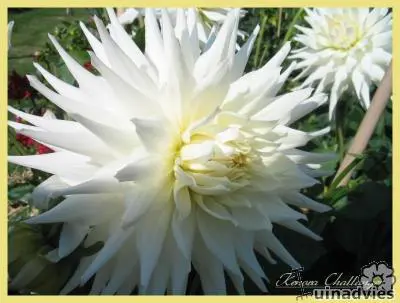 Dahlia 'Kenora Challenger' is een semi-cactusdahlia met goed gevulde grote bloemen. De ivoorwitte bloemblaadjes zijn gedeeltelijk opgerold.