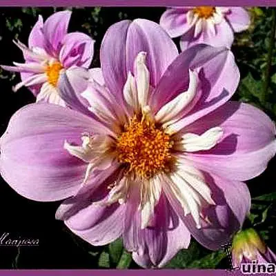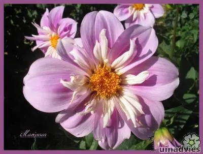 Dahlia 'Mariposa' is een halskraagdahlia (collerette). De lilaroze bloemen hebben brede, platte lintbloemen en rond het oranjegeel hart een rij van kortere witte straalbloemen.