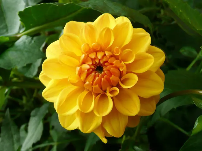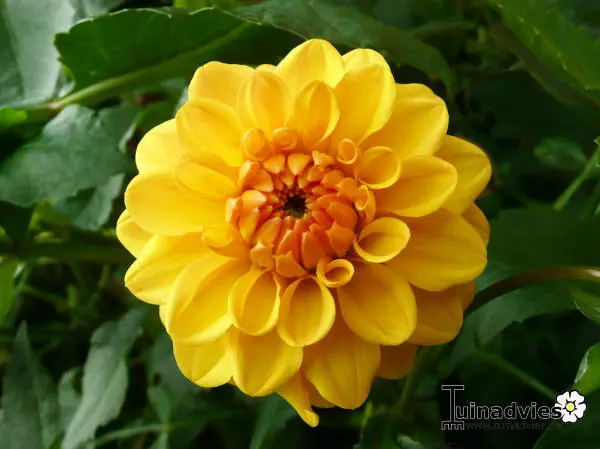 Dahlia 'Sisa' is een lage decoratieve dahlia met goed gevulde bloemen en brede platte, warmgele bloemblaadjes.
