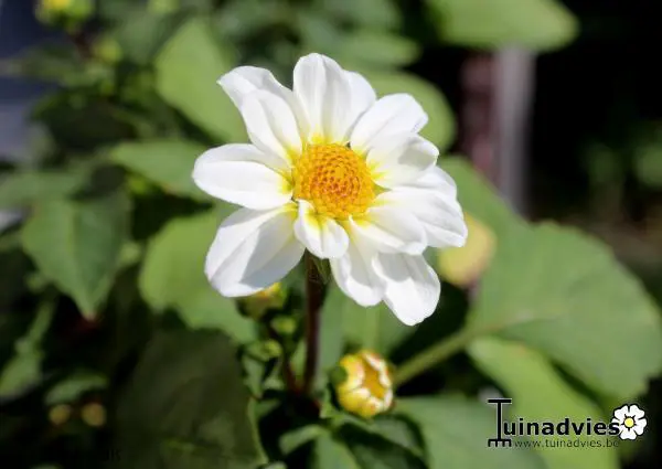 Dahlia 'Topmix White' is een topmix dahlia, is zeer compact en bloeirijk met kleine witte bloemen met een geel hart.