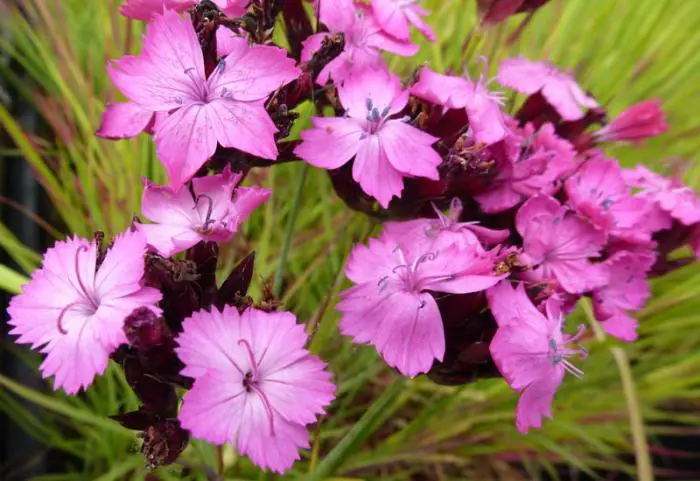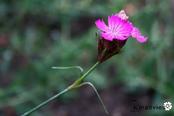 Bloeit op lange fijne stelen met kleine getande, felroze bloemblaadjes met een (bijna) zwarte kelk.