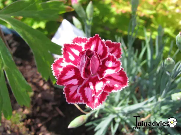 Dianthus 'Starburst' vormt een compacte pol met lineaire grijsgroene bladeren.