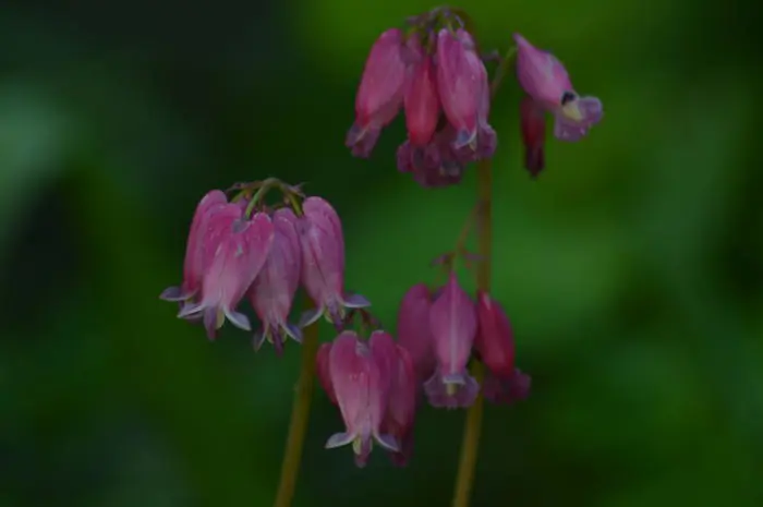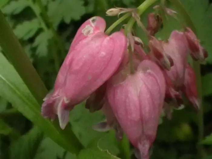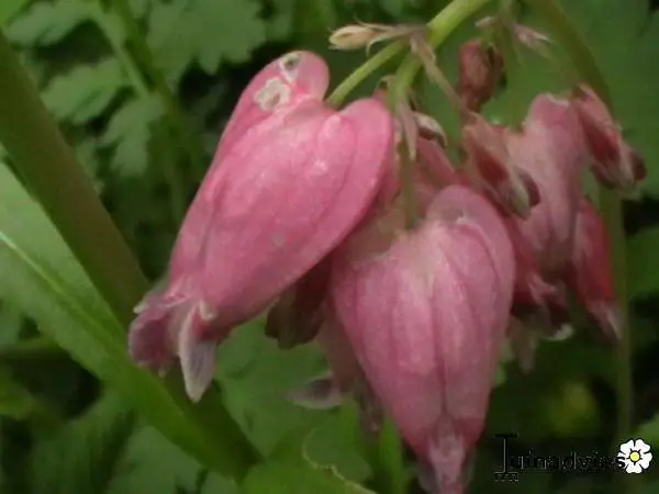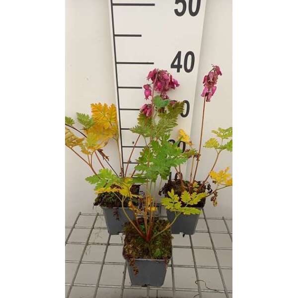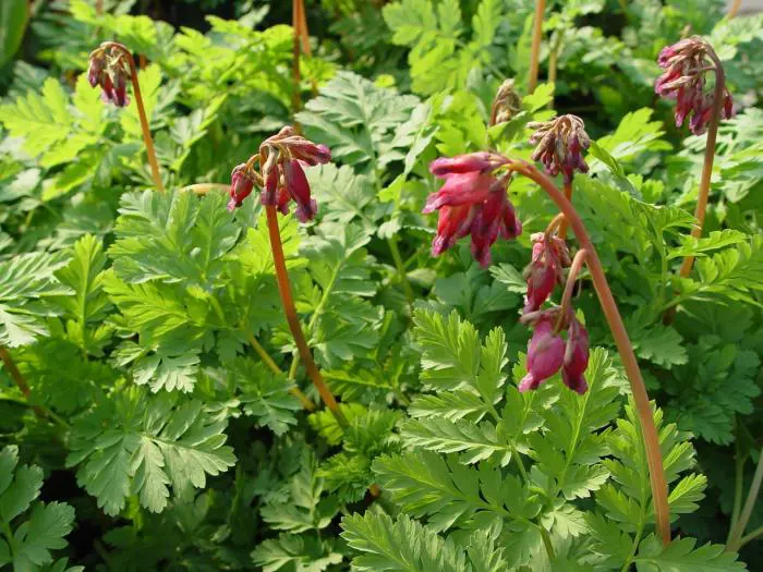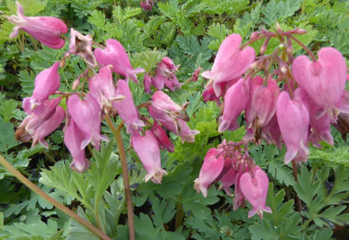 Dicentra formosa 'Luxuriant' heeft een varenachtig grijsgroen blad met hangende trosjes van paarsroze buisvormige bloemen.