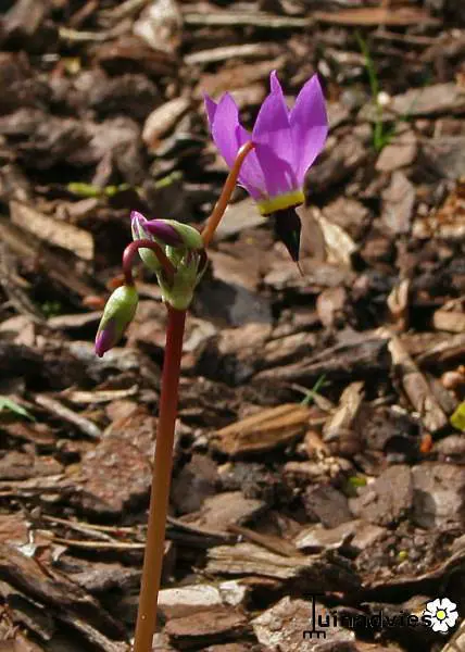 Bloeit op rechtopstaande stelen met paars tot roodpaarse teruggebogen bloemblaadjes die na de bevruchting naar boven draaien en opvallende donkere meeldraden.