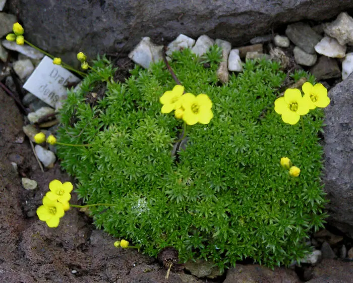 Vormt een kussen van vlezige, behaarde puntige blaadjes en bloeit met heldergele bloemen.