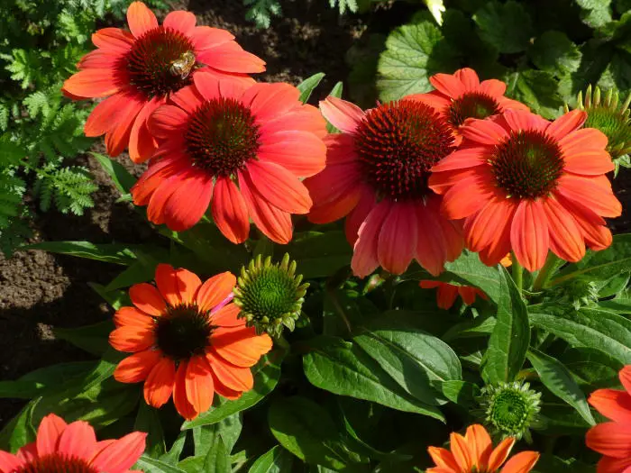E. 'SOMBRERO Hot Coral' bloeit oranje/koraalkleurig met een roodbruine kegel.