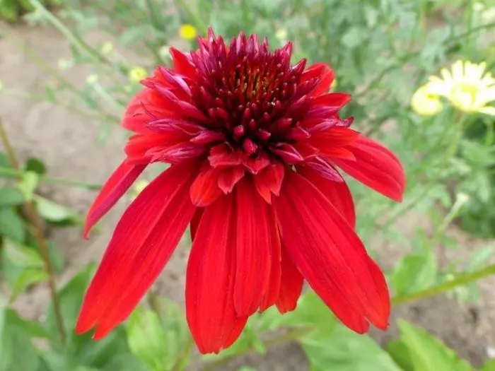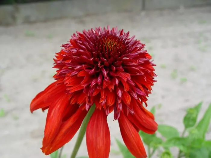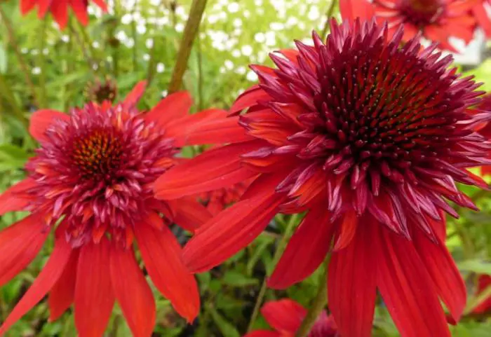 Echinacea purpurea 'Eccentric' bloeit met roodpaarse dubbele bloemen en is goed vertakt.