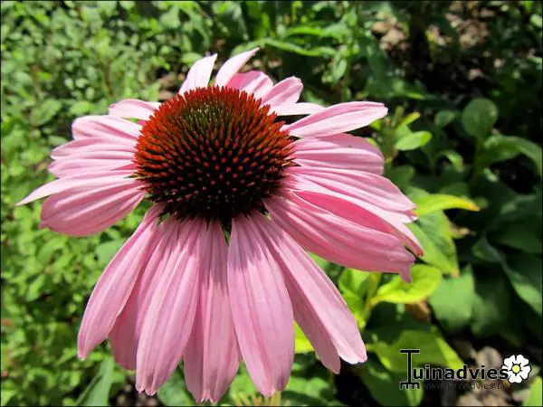 Echinacea purpurea 'Magnus' heeft rozerode bloemen rond een oranjebruine kegel.