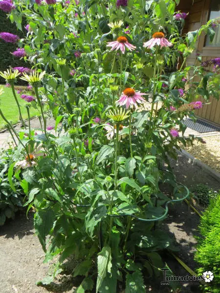 Echinacea purpurea bloeit op hoge rood aangelopen stengels met grote purperroze bloemen met een koperbruine kegel.