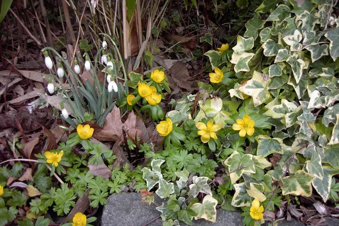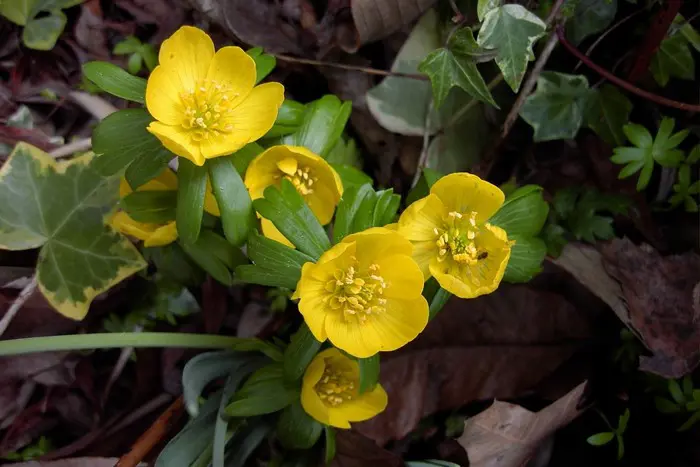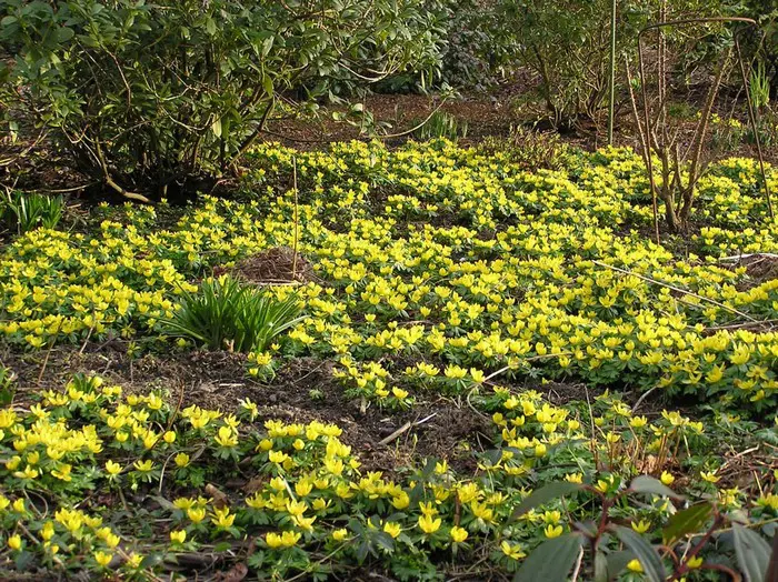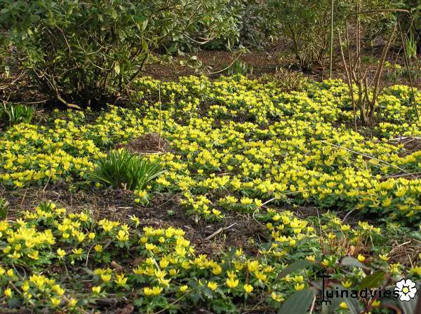 Eranthis is een winterbloeiende, klein knolgewasje, vormt een uitgestrekt tapijt van glanzende felgele bloempjes en gelobde bladeren.