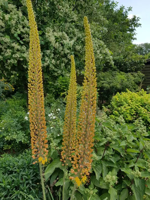 Eremurus x isabellinus 'Pinokkio' bloeit met grote bloemaren. De bloemknoppen zijn roestoranje en bloeien oranjegeel open met later nog een perzikroze zweem.
