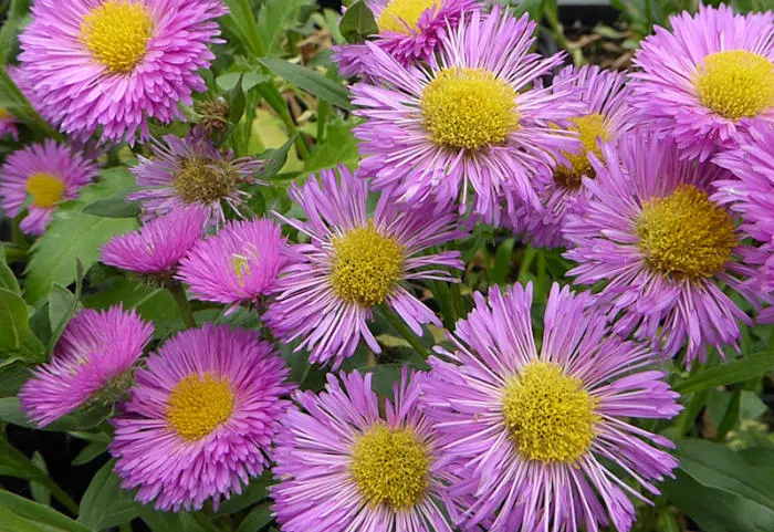 Erigeron 'Foersters Liebling' heeft halfdubbele bloemen met dieproze fijne straalblaadjes rondom een geel oog.