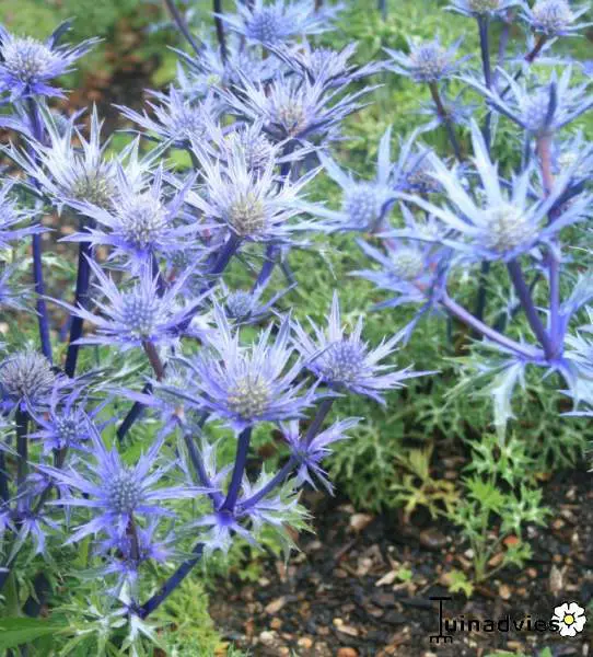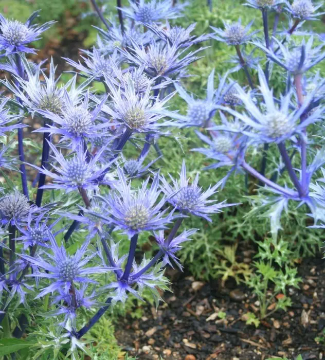 De distelachtige bloem bestaat uit een stekelig, paarsachtig staalblauw schutblad rond een paarsblauwe kegelvormige schermbloem op zilvergrijze tot blauwe stengels.