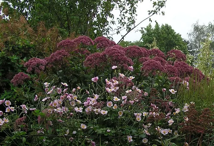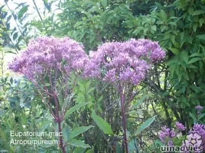 Eupatorium maculatum is een sterke soort met grote, bruin gevlekte, groene stengels met bovenaan de top grote platte tuilen met honderden kleine paarsroze bloemen.