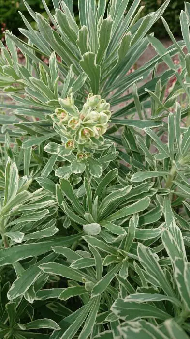 Euphorbia amygdaloides 'Frosted Flame' is een bossige opgaand groeiende plant met cremewit gerande, grijsgroene bladeren die bij koeler weer een rode tint krijgen.
