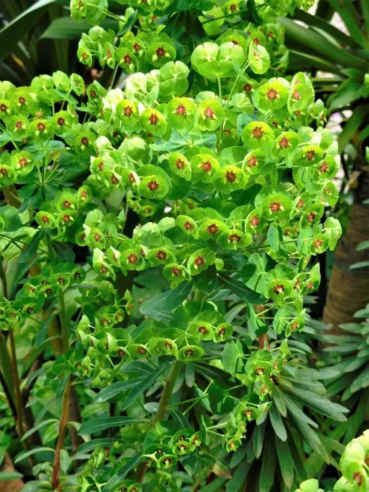Bloeit in het voorjaar op dikke rode stengels met dikke trossen van rode bloemknoppen die geelgroen openbloeien.