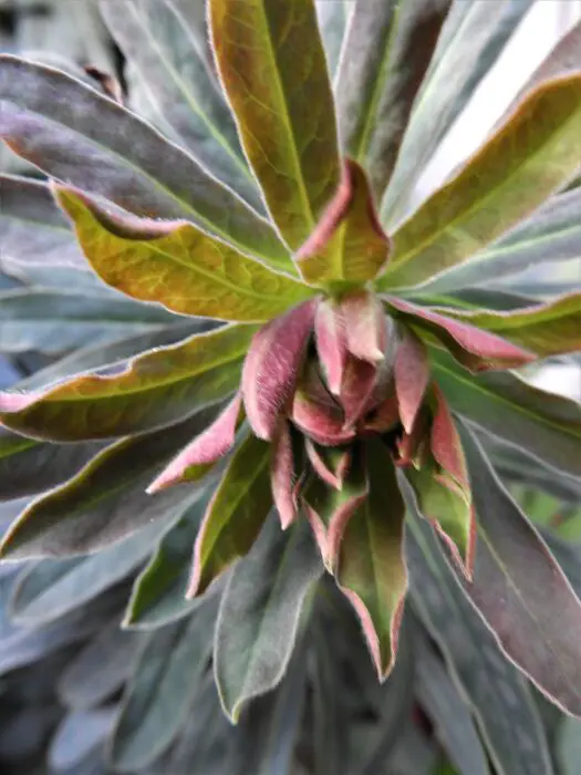 Lancetvormige bladeren lopen helder roodpaars uit en worden daarna geleidelijk bronsgroen.