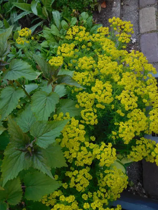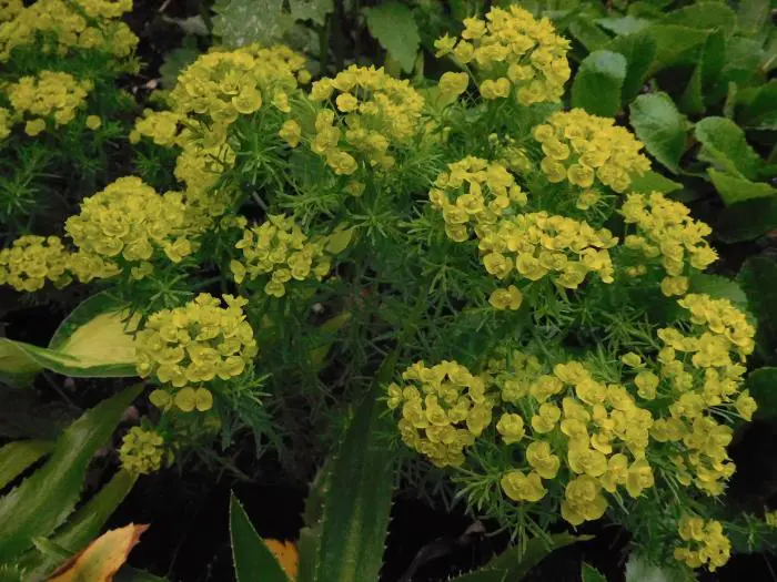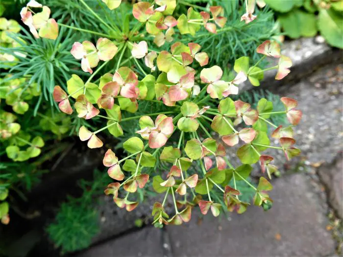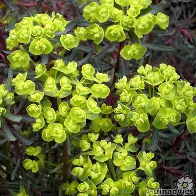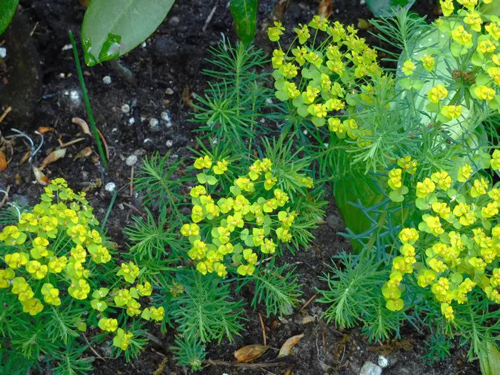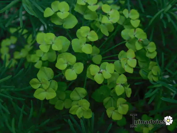 De Euphorbia cyparissias 'Clarice Howard ' is een variëteit die bijzonder decoratief is in het voorjaar, met zijn jonge scheuten en jonge gevederde paarsbruine bladeren. In de zomer zijn de zeer fijne bladeren blauwgroen.