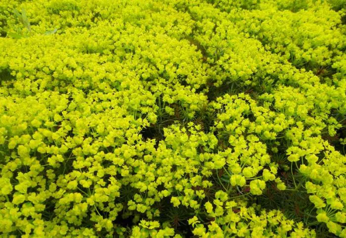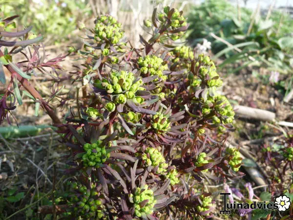 Euphorbia cyparissias 'Fens Ruby' is een bodembedekker met massaal zeer fijne bladeren, paars gekleurd in de lente, blauwgroen in de zomer en roodoranje in de herfst.
