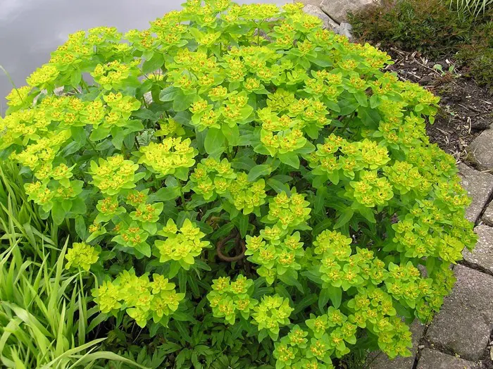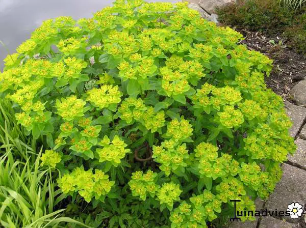Euphorbia epithymoides 'Midas' groeit breed uit en is dan ook een goede bodembedekker met groengele bloemen waarvan de helder goudgele schutbladeren breder zijn dan bij de soort.