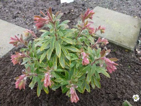 De dikke, blauwgroene bladeren zijn omrand met crèmegeel en wat vooral erg aantrekkelijk is zijn de tweekleurige, bruin/lichtrode jonge scheuten.