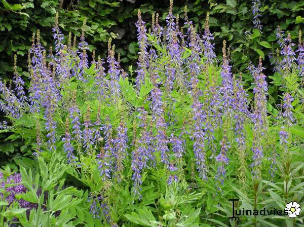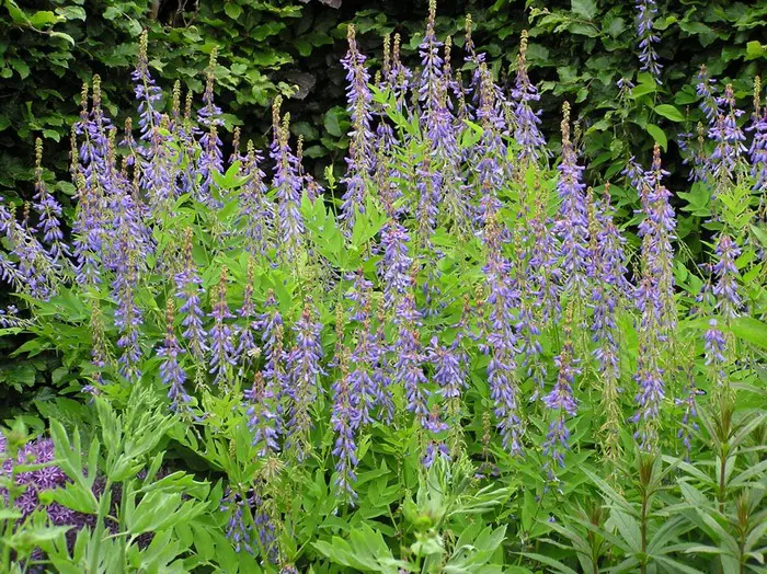 Galega orientalis geeft een luchtig effect in de border met zijn violetblauwe bloei.Woekert lichtjes en moet gesteund worden.