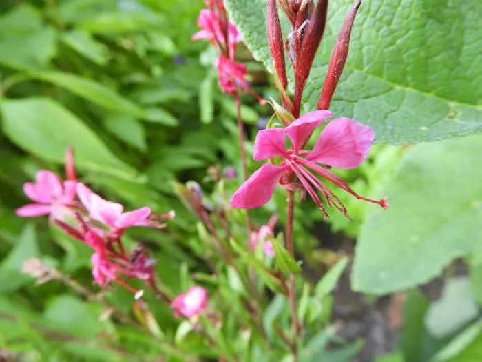 Gaura lindheimeri 'Pink Dwarf' is een kortlevende bossige plant met een lange bloeitijd van dieproze vlinderachtige bloemen uit roze knoppen. Bloeien op lange fijne stelen, wuivend in de wind.