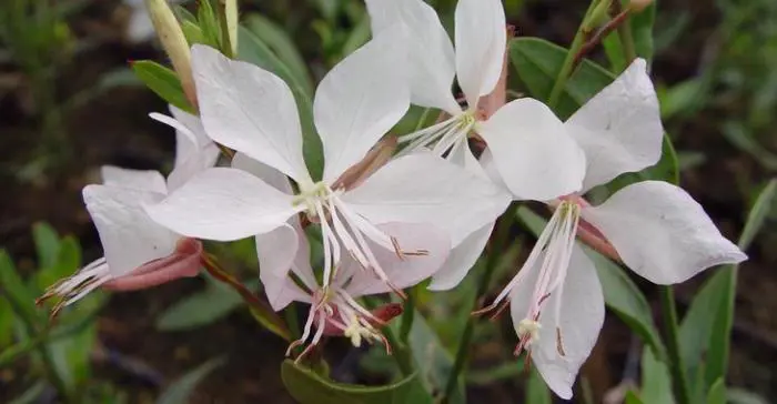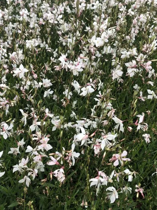 Gaura lindheimeri 'Short form' is een kortlevende, bossige, compacte plant met een lange bloeitijd van witte vlinderachtige bloemen uit lichtroze knoppen. Bloeien op lange fijne stelen, wuivend in de wind.