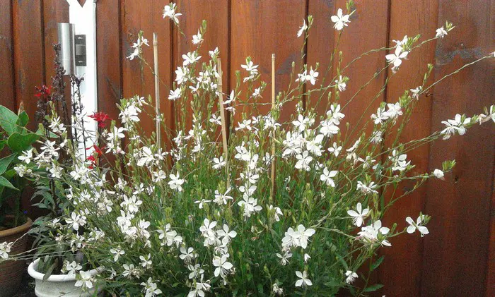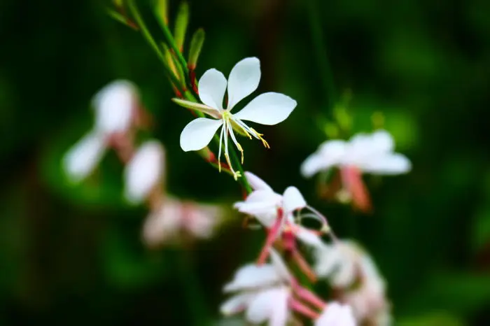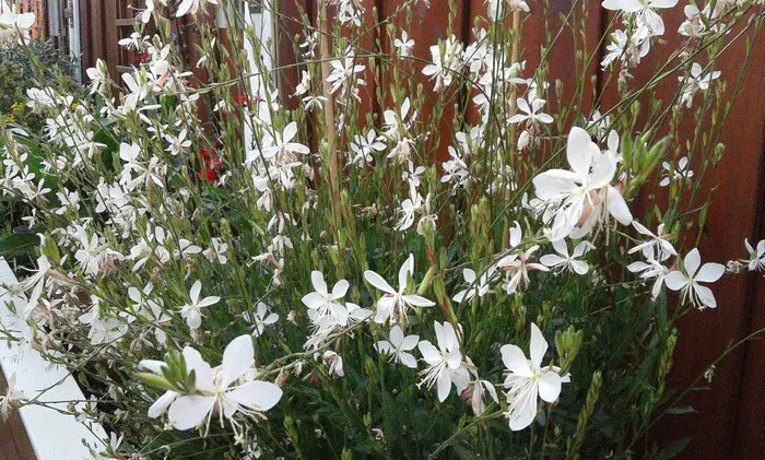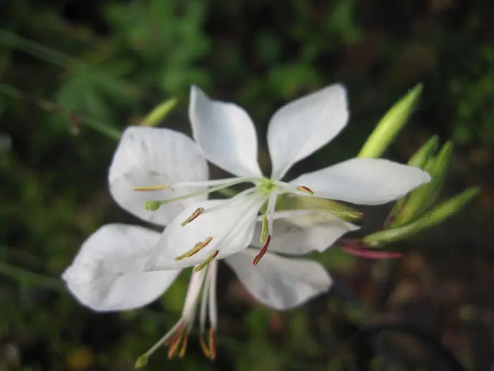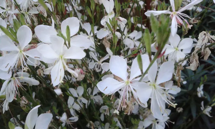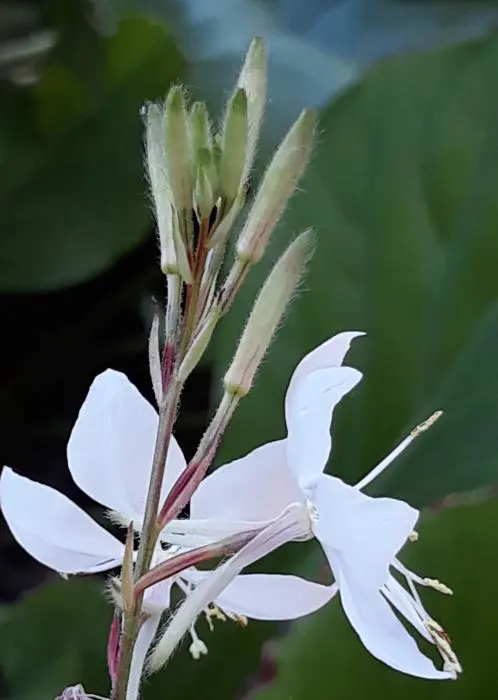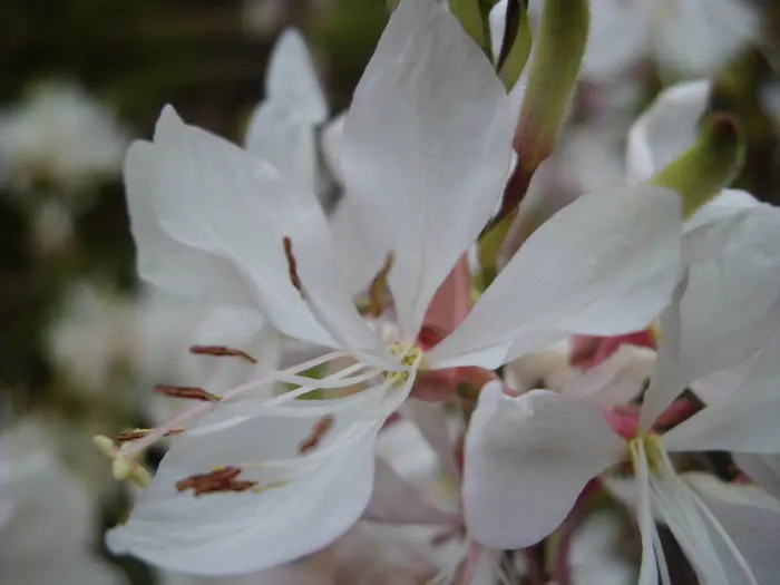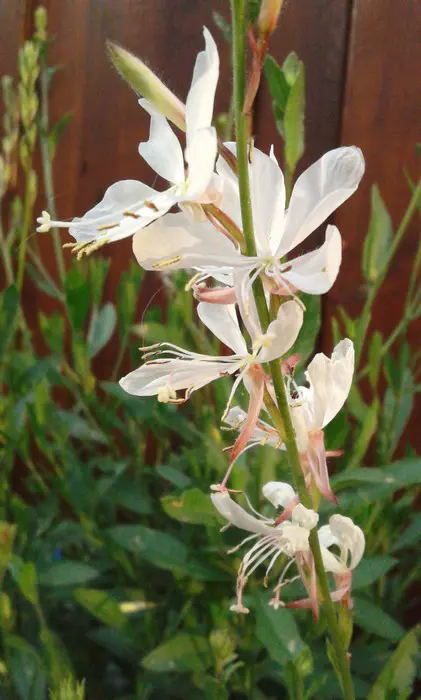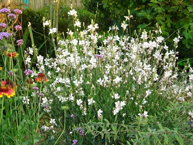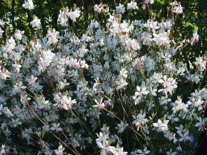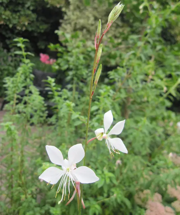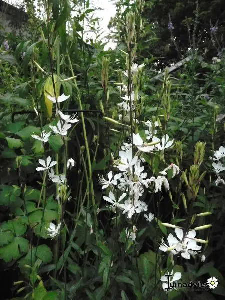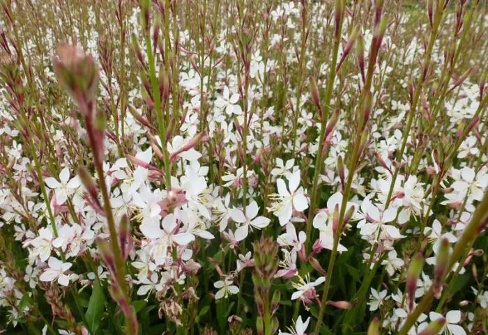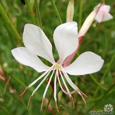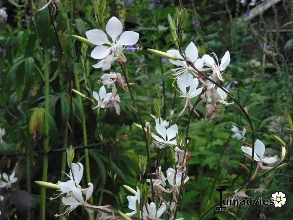 Gaura lindheimeri 'Whirling Butterflies' is een kortlevende bossige plant met een lange bloeitijd van witte vlinderachtige bloemen uit lichtroze knoppen. Bloeien op lange fijne stelen, wuivend in de wind.