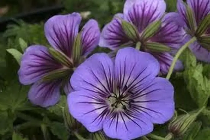 Bloeit met grote donkerviolet geaderde, grijsblauwe bloemen met wit in het hart.