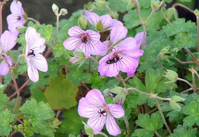 De lichtroze bloemen zijn subtiel geaderd met karmijn en bloeien tot de vorst.