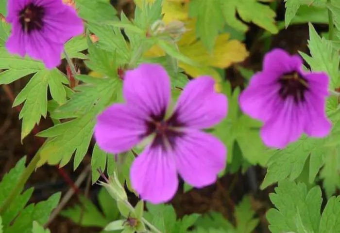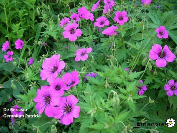 Geranium 'Patricia' is een bossige, licht kruipende bodembedekker met grote donkergroene, diep ingesneden bladeren die mooi rood kleuren in de herfst.