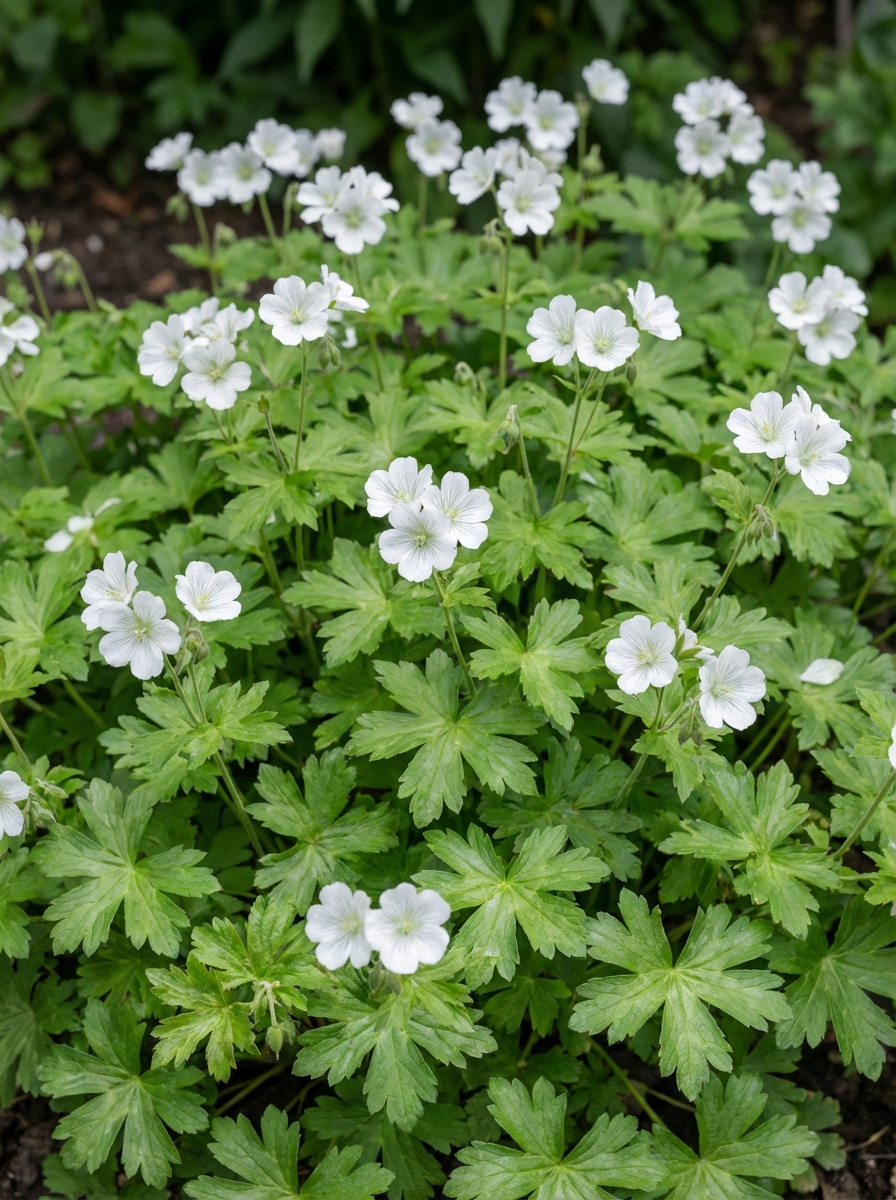 Geranium nodosum 'Silverwood' bloeit met zachtglanzende zuiverwitte bloemblaadjes.