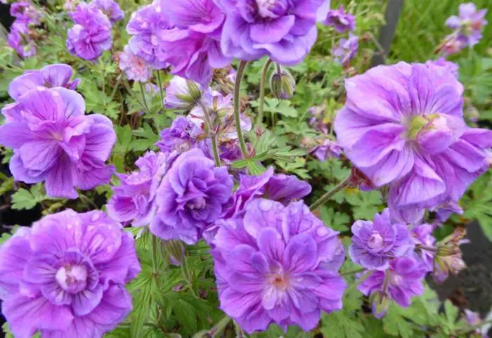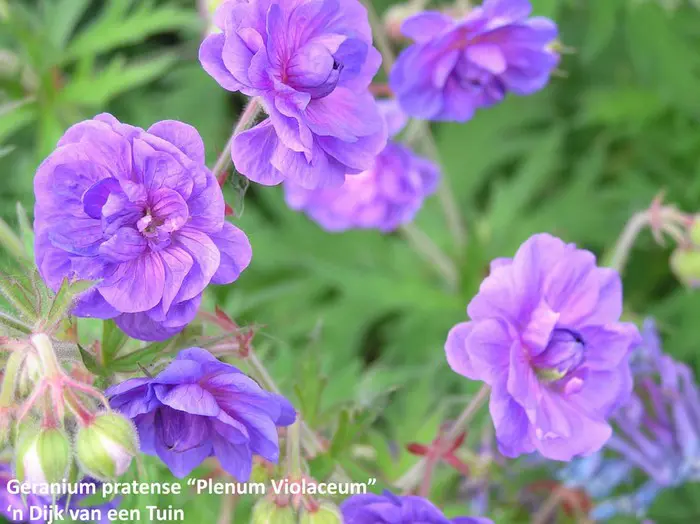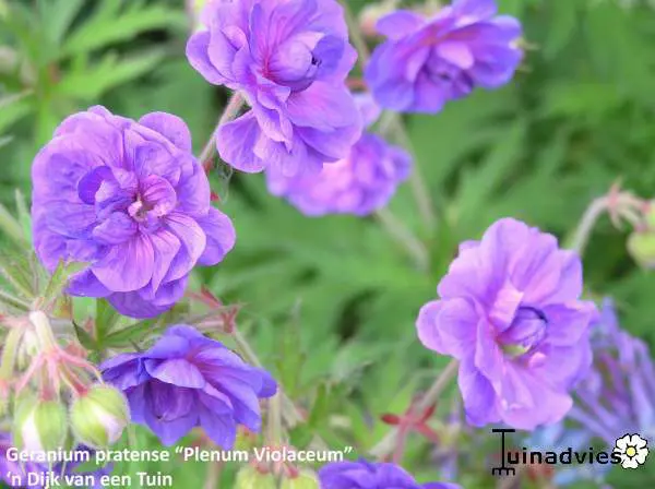 Geranium pratense 'Plenum Violaceum' is een aantrekkelijke variëteit met een compacte groeiwijze met diep ingesneden bladeren.