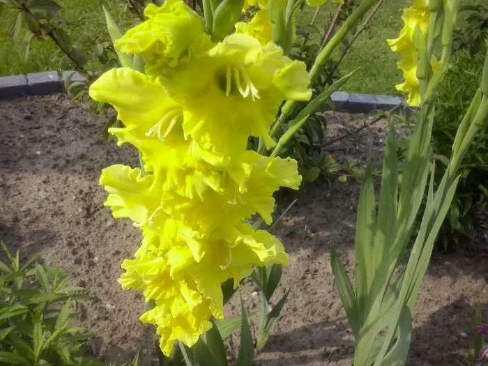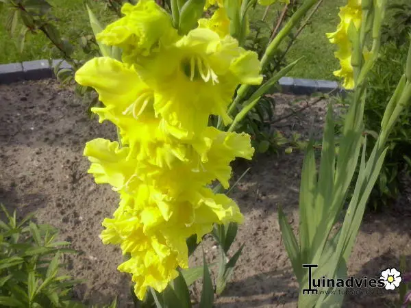 Gladiolus 'Nova Lux' bloeit op rechtopstaande stengels met grote gele bloemen.