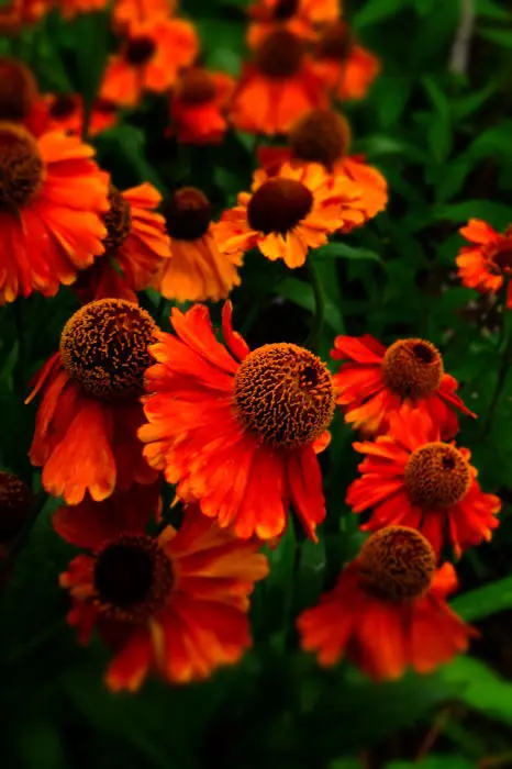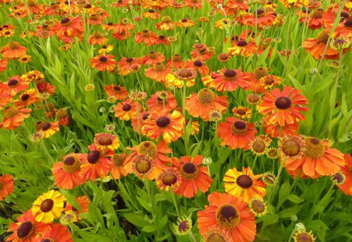 Helenium 'Sahin's Early Flowerer' bloeit met grote bloemen van een flamboyante kleur waarvan de tint in de loop van de zomer verandert, een palet van geel, oranje, rood en koper ontstaat onder de zon.