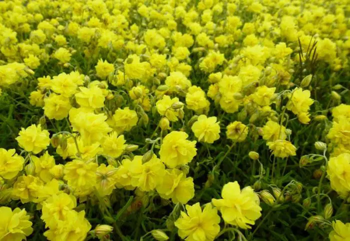 Helianthemum 'Sulphureum Plenum' is een halfheestertje met grijsgroene bladeren en gevulde, heldergele bloemen,
