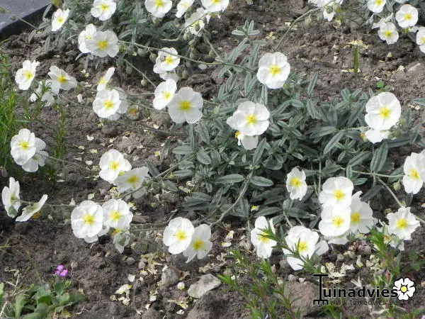 Helianthemum 'The Bride' ook 'Snow Queen' is een halfheestertje met grijsgroene blaadjes en witte bloempjes met een geel hart.